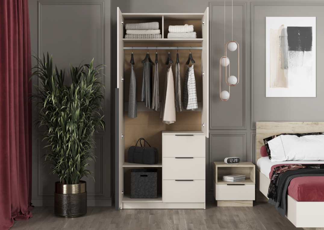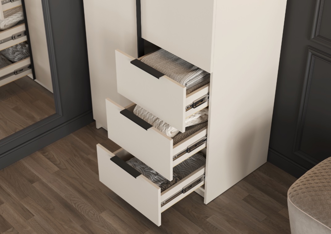 • Элегантный дизайн: Накладные фасады шкафа выполнены в стильном цвете "Кашемир". Левая створка и фасады ящиков оснащены черными пластиковыми ручками, а правая створка - без ручки, что добавляет минималистичный акцент.