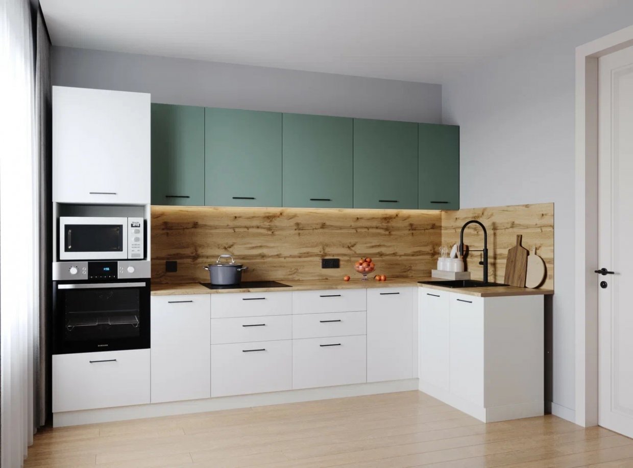 • Фасады со свесом – дают возможность использовать верхние модули без установки ручек, а также установить скрытую подсветку